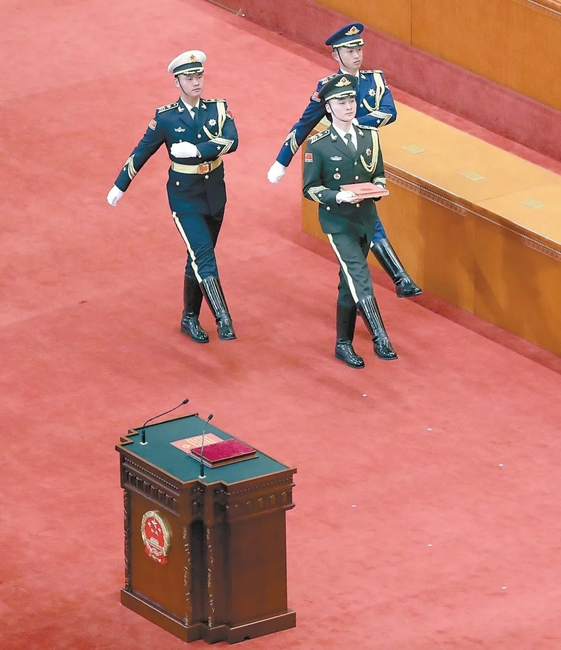 2018年3月17日,中華人民共和國第十三屆全國人民代表大會第一次會議憲法宣誓儀式在北京人民大會堂舉行。主席臺上,3名禮兵邁著正步護送《中華人民共和國憲法》入場。新華社記者 龐興雷 攝