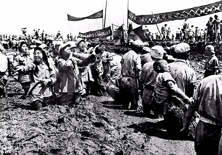 1952年,廣大軍民奮戰(zhàn)在荊江分洪水利工程上。(資料圖片)