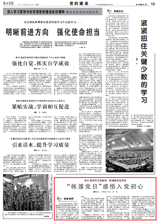 8月初,第81集團(tuán)軍某旅在演訓(xùn)一線廣泛開展以“不忘初心,砥礪前行”為主題的“帳篷黨日”活動(dòng),激勵(lì)廣大黨員在演訓(xùn)場上、任務(wù)一線追憶入黨初心,以飽滿熱情投身練兵備戰(zhàn)。請(qǐng)關(guān)注今日《解放軍報(bào)》的報(bào)道——
