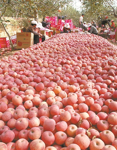 中國蘋果產(chǎn)量目前占全世界產(chǎn)量55%左右。在陜西延長縣,近年來科技扶貧推動了蘋果產(chǎn)業(yè)發(fā)展。這是當(dāng)?shù)毓r(nóng)在果園里分揀包裝蘋果。(資料圖片)