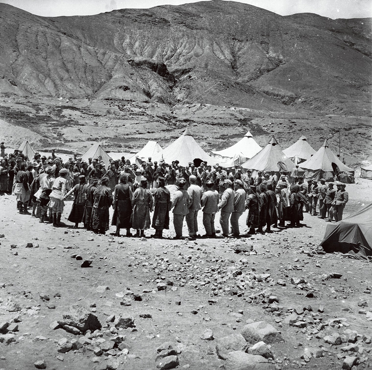 1959年,原成都軍區(qū)部隊(duì)參加西藏平叛作戰(zhàn),廣大藏族群眾積極支援部隊(duì),協(xié)同捕捉殘匪。圖為官兵與藏民聯(lián)歡。范士林 攝