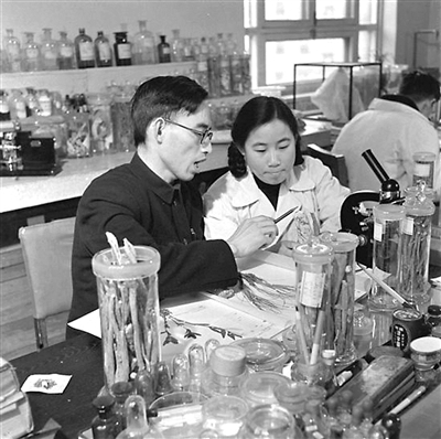 上世紀(jì)50年代,在中醫(yī)研究院中藥研究所任研究實(shí)習(xí)員的屠呦呦(前右)與老師樓之岑一起研究中藥。(資料圖片)