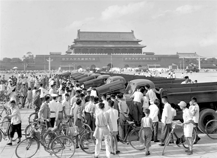 第一汽車制造廠制造出來(lái)的第一批38輛“解放牌”汽車,在1956年8月21日運(yùn)到北京。這批汽車參加當(dāng)年首都國(guó)慶節(jié)的檢閱和游行。這是“解放牌”汽車停留在天安門廣場(chǎng)上,人們紛紛趕來(lái)參觀。(資料圖片)