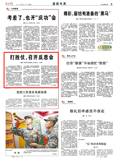 前不久,連隊在旅組織的對抗演練中表現(xiàn)突出,打了一個大勝仗??墒欠禒I后不少官兵明顯放松了要求,于是連里決定開個反思會……請關(guān)注今日《解放軍報》的報道——