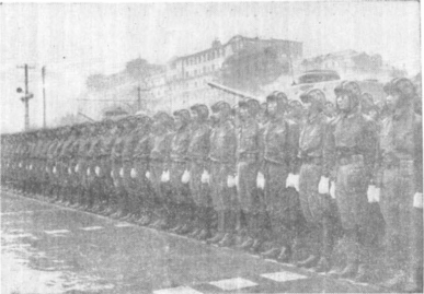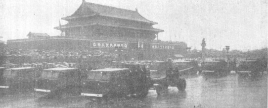 1956年國(guó)慶受檢閱的中國(guó)人民解放軍冒雨經(jīng)過天安門廣場(chǎng)。