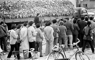 地處華北平原的北京市冬季蔬菜品種少,因此價(jià)格低廉、易貯存的大白菜成為居民飯桌上的“當(dāng)家菜”。這是1988年11月12日,北京市民在一個(gè)晝夜?fàn)I業(yè)的冬貯白菜銷售點(diǎn)排隊(duì)購(gòu)買白菜。(資料圖片)