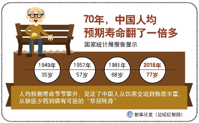 小病奪命成歷史,長命百歲不稀奇。70年,中國人均預期壽命從35歲增長到77歲,翻了一倍還多。
