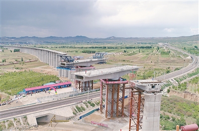2018年6月13日,由中鐵二十局承建的京張高鐵崇禮支線最長(zhǎng)橋趙川鎮(zhèn)高架特大橋上跨唐呼鐵路現(xiàn)澆連續(xù)梁轉(zhuǎn)體成功。連續(xù)梁長(zhǎng)144米,轉(zhuǎn)體角度68度,單轉(zhuǎn)體部分的總重量2306噸,轉(zhuǎn)體73分鐘后,在高空精準(zhǔn)對(duì)接,這標(biāo)志著京張高鐵主線、崇禮支線最后一座連續(xù)梁轉(zhuǎn)體成功。這是當(dāng)日無人機(jī)拍攝的施工現(xiàn)場(chǎng)。新華社發(fā)(馬佳琦 攝)