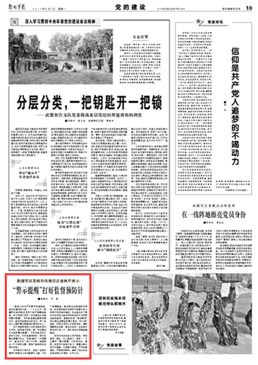 新疆軍區(qū)某師按照預(yù)防為主的思路抓黨風(fēng)正作風(fēng),堅(jiān)持每月制定一期“作風(fēng)建設(shè)正反典型警示提醒”,下發(fā)全體黨員干部學(xué)習(xí)討論,打好監(jiān)督預(yù)防針。請(qǐng)關(guān)注《解放軍報(bào)》的報(bào)道——