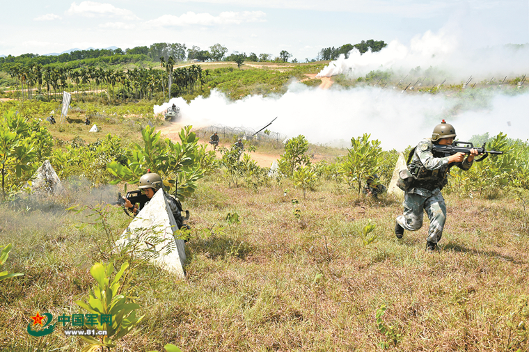 該旅實(shí)兵對(duì)抗演練中,紅方隊(duì)員發(fā)起進(jìn)攻。謝 煒攝