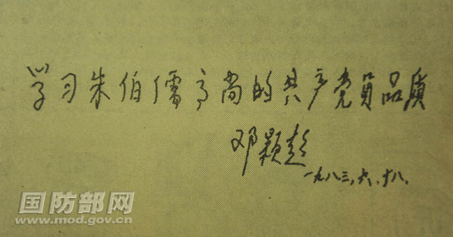 鄧穎超題詞:“學(xué)習(xí)朱伯儒高尚的共產(chǎn)黨員品質(zhì)”。(