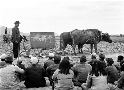 1955年,遼寧省復(fù)縣沙坨村的掃盲班在地里通過實物進行掃盲教學(xué)。新華社發(fā)(資料照片)