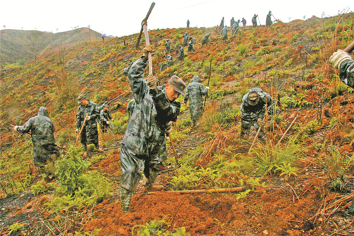 在我國(guó)迎來(lái)第38個(gè)植樹(shù)節(jié)之際,人民子弟兵為祖國(guó)生態(tài)文明建設(shè)交出厚重的“綠色答卷”:“十二五”期間,全軍和武警部隊(duì)堅(jiān)決貫徹黨中央、中央軍委和習(xí)主席關(guān)于推進(jìn)生態(tài)文明建設(shè)、建設(shè)美麗中國(guó)戰(zhàn)略部署,興起了營(yíng)區(qū)造林綠化和參加駐地義務(wù)植樹(shù)熱潮,共出動(dòng)兵力200余萬(wàn)人次、動(dòng)用機(jī)械車(chē)輛10萬(wàn)臺(tái)次,參加駐地植樹(shù)綠化60萬(wàn)畝,完成軍事區(qū)域荒山荒地造林300萬(wàn)畝、林草管護(hù)2000萬(wàn)畝,創(chuàng)建綠色生態(tài)營(yíng)區(qū)320多個(gè),為改善部隊(duì)養(yǎng)兵練兵環(huán)境、維護(hù)國(guó)土生態(tài)安全作出了貢獻(xiàn)。