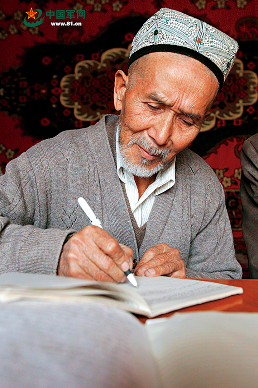 欄桿村是個少數(shù)民族村,中專畢業(yè)懂漢語的卡德爾便成了部隊和村民之間的翻譯。村民有什么困難都通過他傳到部隊,而部隊每幫村民做一件事情,卡德爾都看在眼里,記在紙上。當時卡德爾沒有本子,只能是找到一些零零散散的紙,寫滿一張紙就放到箱子里保存起來,有了小本子以后,卡德爾便把日記一篇篇抄到小本子上??ǖ聽柕娜沼浺呀?jīng)記了厚厚的5本,并決心把“擁軍日記”子子孫孫寫下去。1000多篇日記,記錄了解放軍為老百姓做的每一件好事,見證了欄桿村每一個難忘的昨天,是庫車45萬軍民攜手共建社會主義和諧社會的具體體現(xiàn)??ǖ聽柎笫宓氖论E在天山南北、軍營內外廣為傳頌,成為新時期邊疆軍政軍民團結,民族團結的一個縮影,是軍愛民、民擁軍的真實寫照。