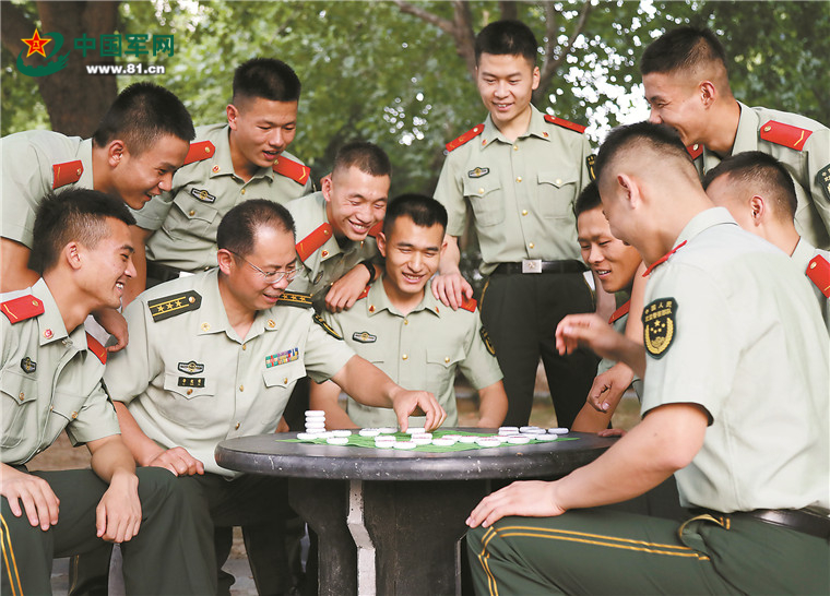 業(yè)余時間,魯憲甫(左前二)喜歡和官兵“殺一盤”。