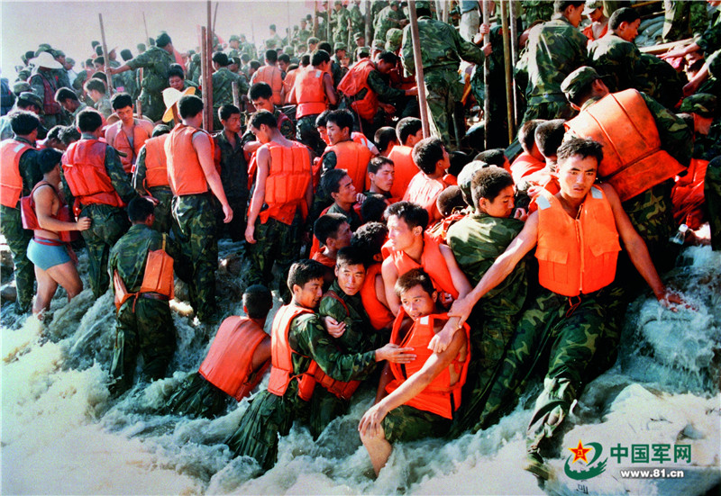 1998年夏,人民子弟兵在江西九江奮力抗洪搶險,誓死保衛(wèi)長江大堤。攝影岱天榮