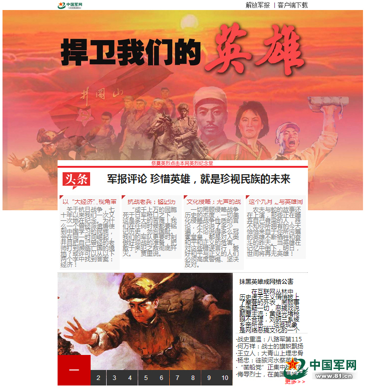 針對網(wǎng)上歪曲我黨我軍歷史、抹黑革命先烈和英雄人物的陰風(fēng)邪氣,全軍部隊打響了一場捍衛(wèi)英雄、固根鑄魂的“上甘嶺戰(zhàn)役”。董存瑞、狼牙山五壯士、邱少云、黃繼光、雷鋒生前所在部隊開展形式豐富的“認識英雄、關(guān)愛英雄、尊崇英雄”活動,批駁詆毀英雄的謠言,增強社會對英雄的價值認同。