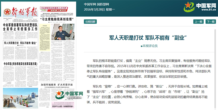 軍隊的根本職能是打仗,偏離“主業(yè)”禍患無窮。習(xí)主席作出全面停止軍隊有償服務(wù)的果斷決策,全軍上下拍手稱快。今年6月,人才培訓(xùn)、基建營房工程技術(shù)、儲運(yùn)設(shè)施等10個行業(yè)全面徹底停止有償服務(wù)。