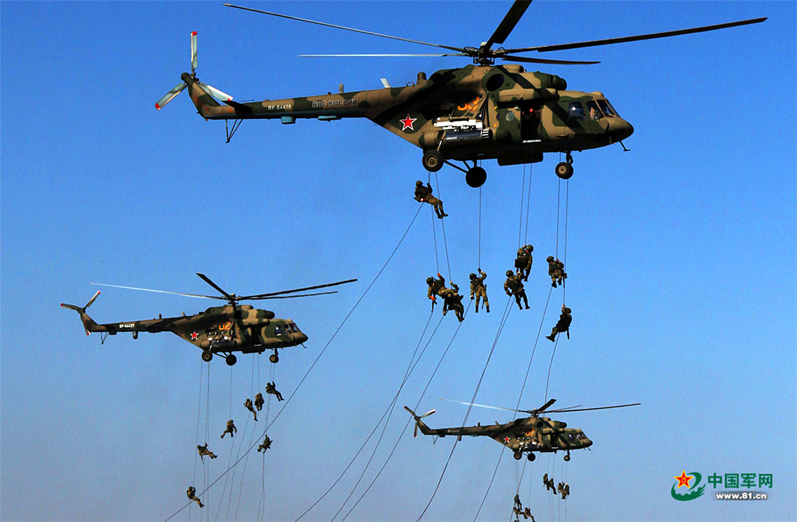 俄軍特戰(zhàn)隊(duì)員實(shí)施索降。
