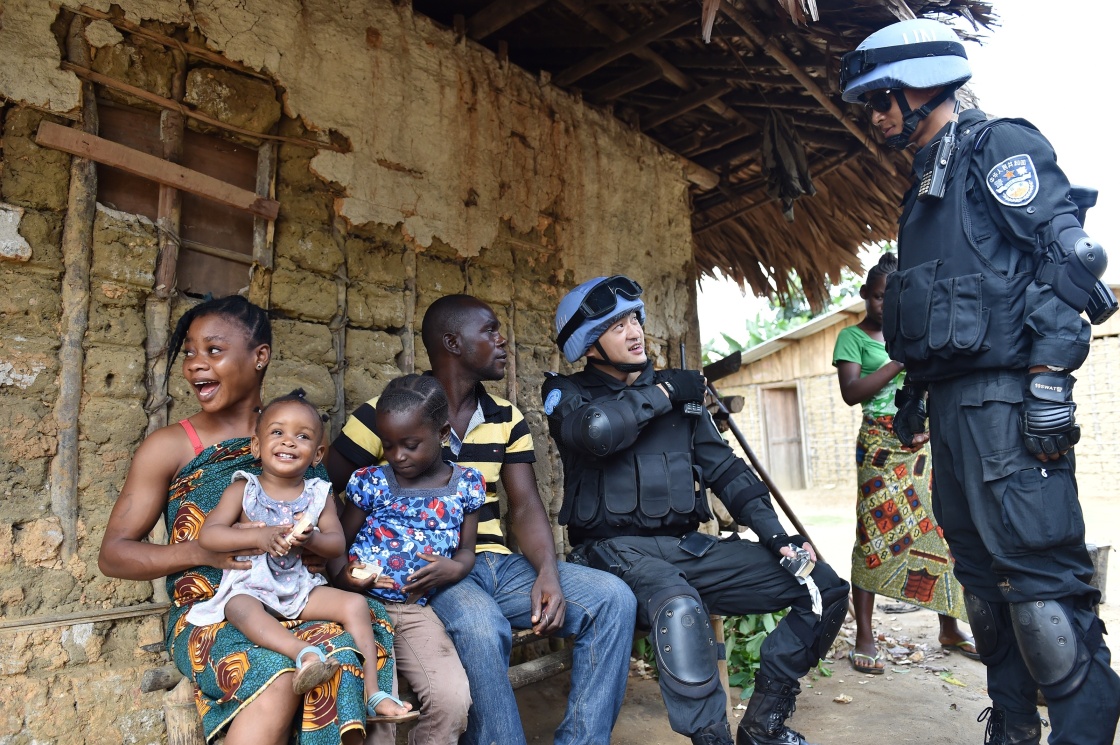 這是2015年11月3日,在利比里亞格林維爾一座村莊,中國維和警察防暴隊隊員詢問近期治安等情況。新華社記者 孫瑞博 攝