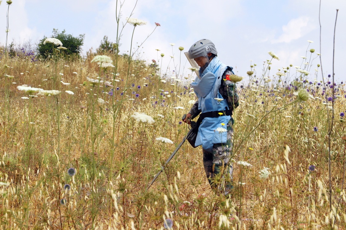 這是2019年6月18日,在位于黎巴嫩與以色列邊境的一處雷場(chǎng),中國(guó)第18批赴黎巴嫩維和部隊(duì)掃雷作業(yè)手正在探測(cè)地雷。新華社發(fā)(孫帥攝)