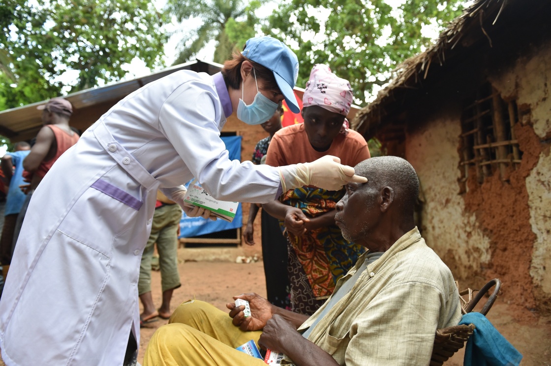 這是2015年11月1日,在利比里亞綏德魯市附近村莊,中國第18批赴利比里亞維和部隊醫(yī)療分隊護士長李煒為一名當(dāng)?shù)乩先酥v解如何用藥。新華社記者 孫瑞博 攝