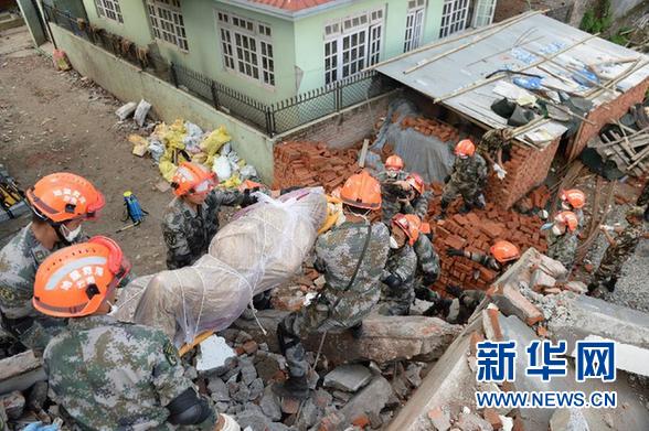 4月30日,在尼泊爾加德滿都市郊一處坍塌的建筑廢墟中,中國(guó)第十四集團(tuán)軍工兵團(tuán)地震救援隊(duì)抬出一具遇難者遺體。 新華社記者 秦晴 攝