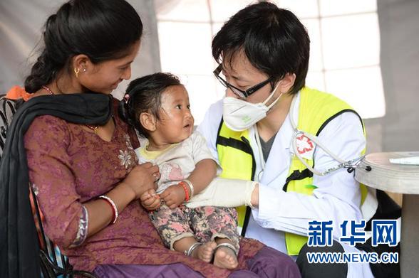 5月3日,在尼泊爾巴德崗重災(zāi)區(qū),中國(guó)紅十字國(guó)際救援隊(duì)武警總醫(yī)院醫(yī)療分隊(duì)隊(duì)員為受災(zāi)民眾看病。 新華社發(fā)(程瑩攝)