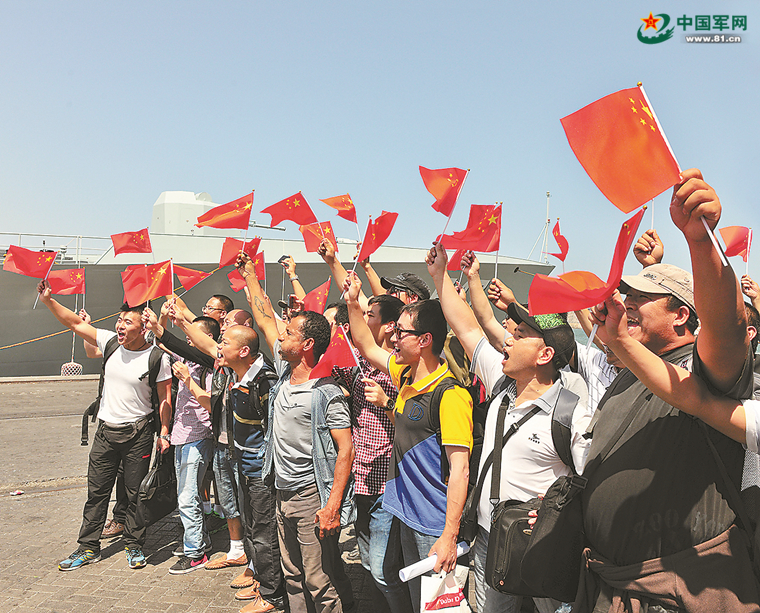 交戰(zhàn)區(qū)就在港外,甚至站在甲板上就可以清晰看見遠處倒塌的房屋以及爆炸后升起的濃煙。而碼頭上,等待安檢的外國公民早已熱淚盈眶,高舉雙手豎起大拇指歡呼“感謝中國!”