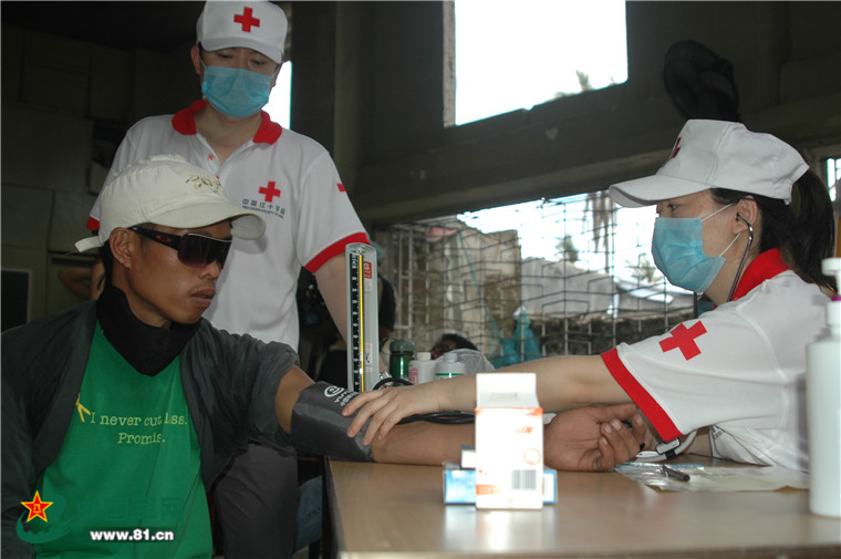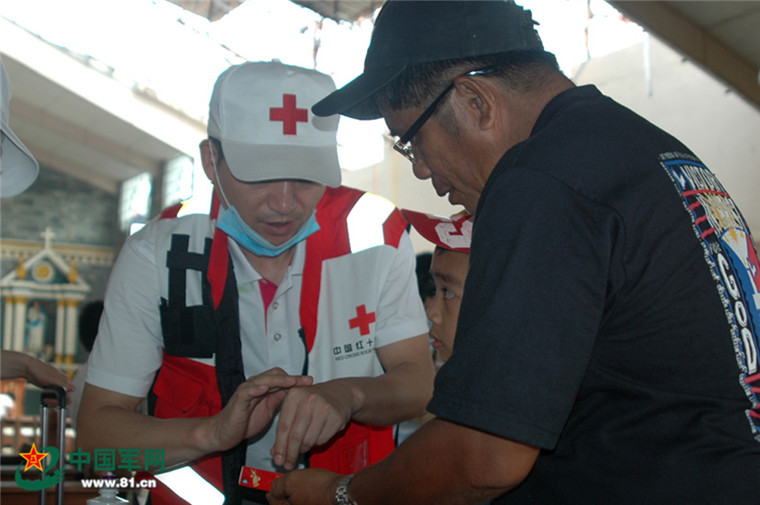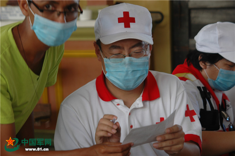 醫(yī)療隊(duì)員為災(zāi)民診斷病情。