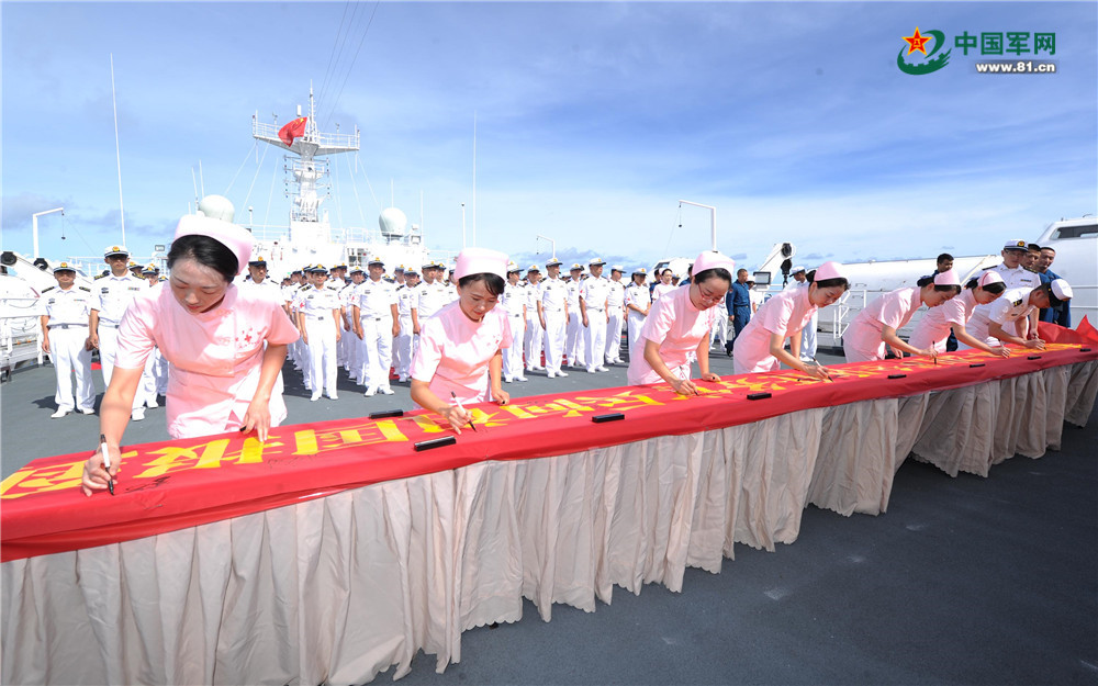 和平方舟醫(yī)院船在凱旋之際舉行“向祖國報(bào)到”簽名儀式。江山 攝