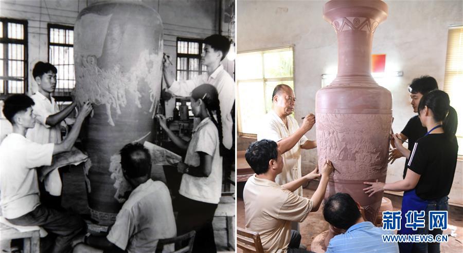 拼版照片:左圖為1973年,李人帡(左二)在廣西欽州坭興陶工廠學(xué)習(xí)制作坭興陶技藝(李人帡提供);右圖為2019年6月14日,李人帡(左二)在廣西欽州的車間研究坭興陶雕刻制作工藝(新華社記者張愛林?jǐn)z)。