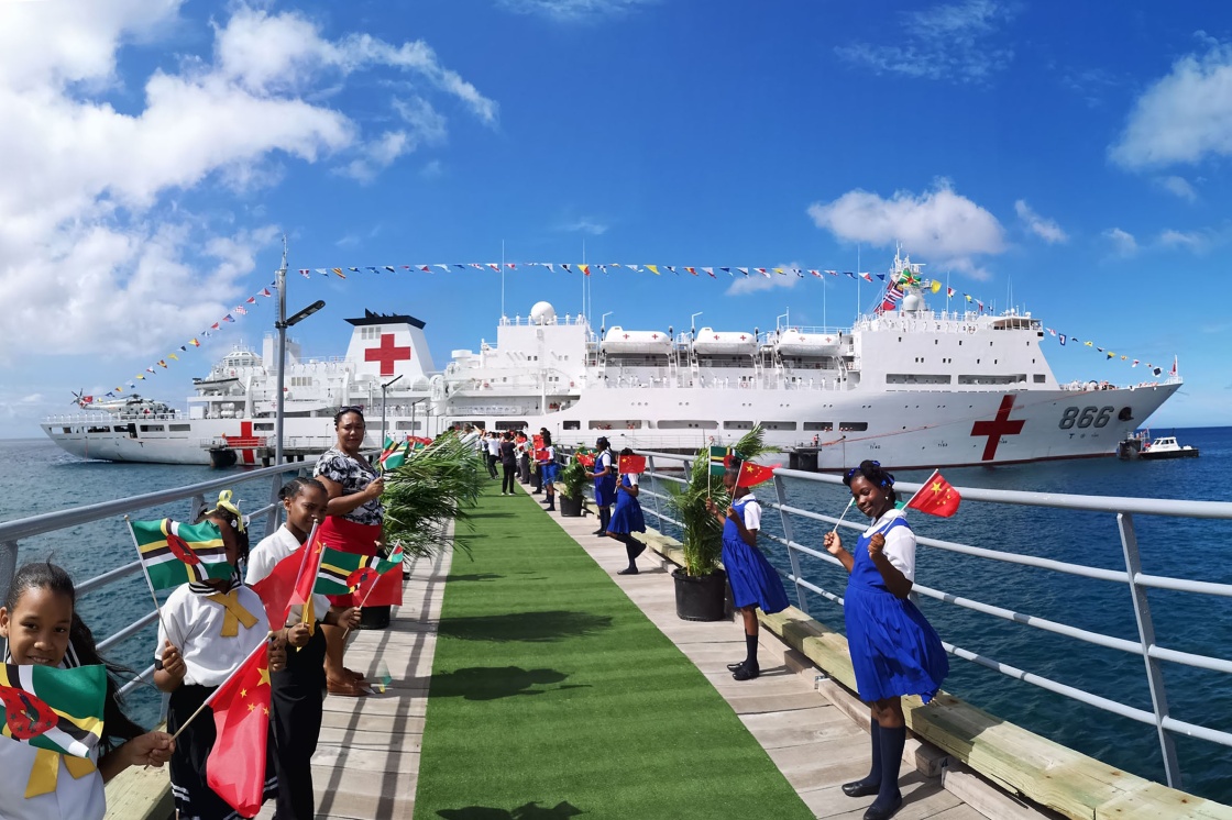 在多米尼克首都羅索,當(dāng)?shù)貙W(xué)生揮動多中兩國國旗歡迎中國海軍和平方舟醫(yī)院船首次到訪(2018年10月12日攝)。