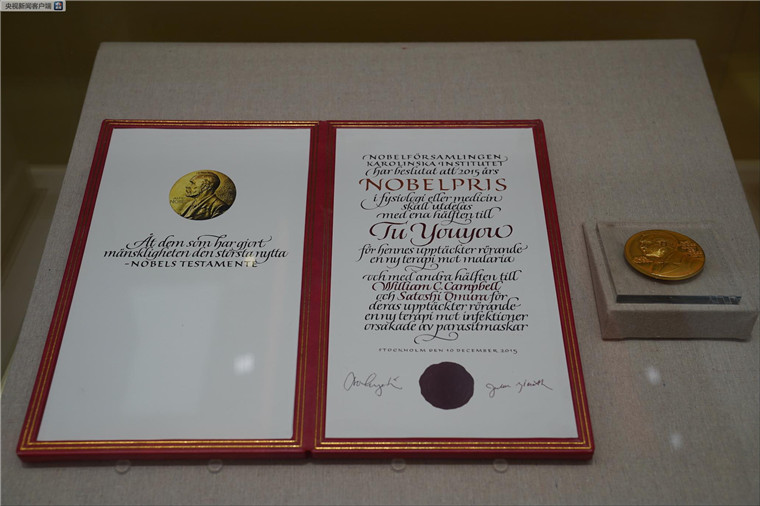 2015年屠呦呦獲得的諾貝爾生理學(xué)或醫(yī)學(xué)獎(jiǎng)獎(jiǎng)?wù)录白C書。