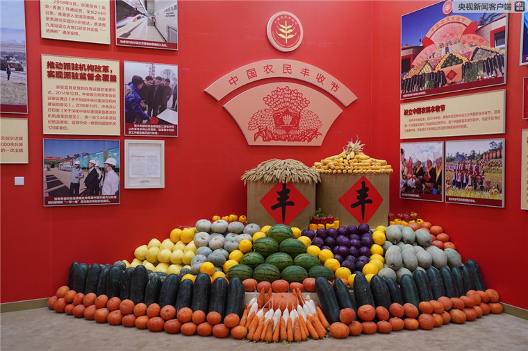 總書記參觀這一天,正好是中國農(nóng)民豐收節(jié)。展區(qū)一角是濃濃的豐收景象。
