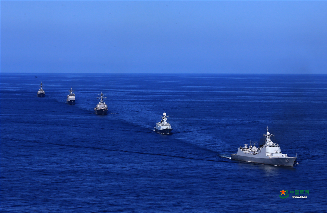 中國(guó)海軍第20批護(hù)航編隊(duì)濟(jì)南艦、益陽(yáng)艦與美方參演三艦組成單縱隊(duì)航行。代宗鋒 攝