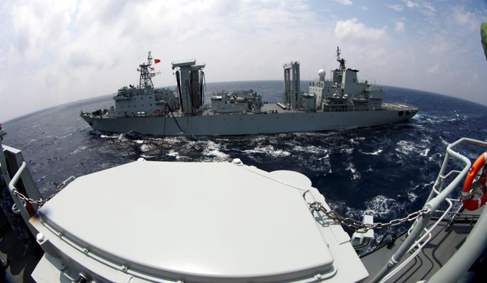 中國海軍第三十三批護航編隊在南海南部海域進行首次海上補給。