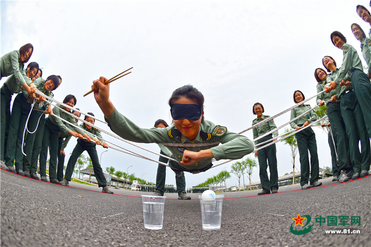 小憩間隙,女兵迅速補(bǔ)充水分。