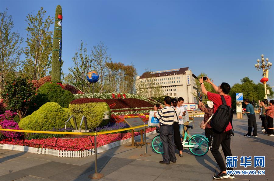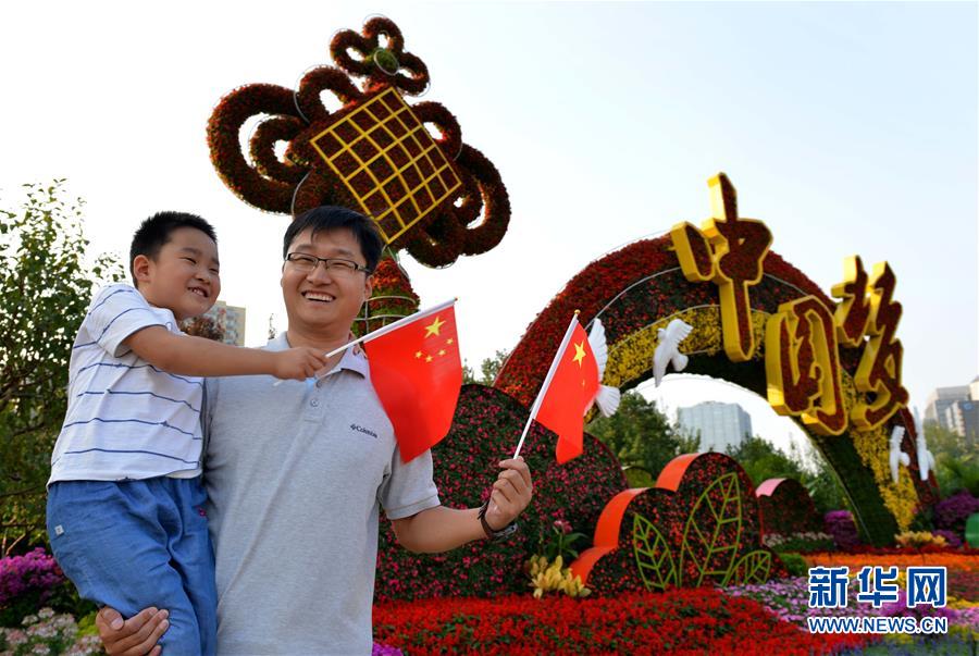 9月23日,市民在“美好明天”花壇前留影。 新華社發(fā) 任超 攝