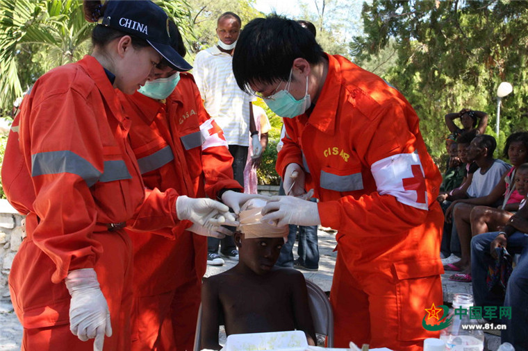 武警總醫(yī)院赴海地國際救援醫(yī)療隊正在為患者包扎傷口,作為目前唯一提供醫(yī)療救助的國際救援隊,大量患者集聚在周圍等待治療。