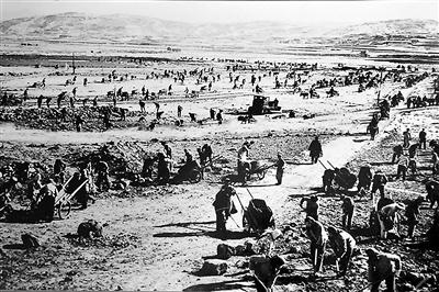 1956年3月1日,陜、甘、晉、豫、內(nèi)蒙古五省(區(qū))青年造林大會在延安召開。當天,延安大禮堂門口懸掛著兩幅醒目的標語:“青少年們!綠化黃土高原,控制水土流失,和水、旱、風沙等自然災害作斗爭”;“青少年們!都來采種育苗,植樹造林,護林防火,讓祖國河山更加美麗”。