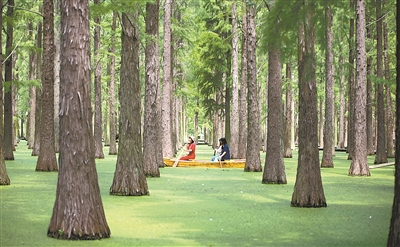 2019年8月18日,游客在江蘇省揚州市淥洋湖濕地公園的“水上森林”游玩。初秋時節(jié),淥洋湖濕地公園內(nèi),水杉、池杉郁郁蔥蔥,美如畫卷。孟德龍 攝