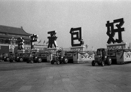 △ 1984年10月1日,國(guó)慶35周年慶典的游行彩車(chē)打出“聯(lián)產(chǎn)承包好”的標(biāo)語(yǔ)。