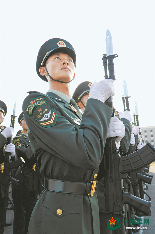 陸軍方隊(duì)進(jìn)行舉槍禮訓(xùn)練。