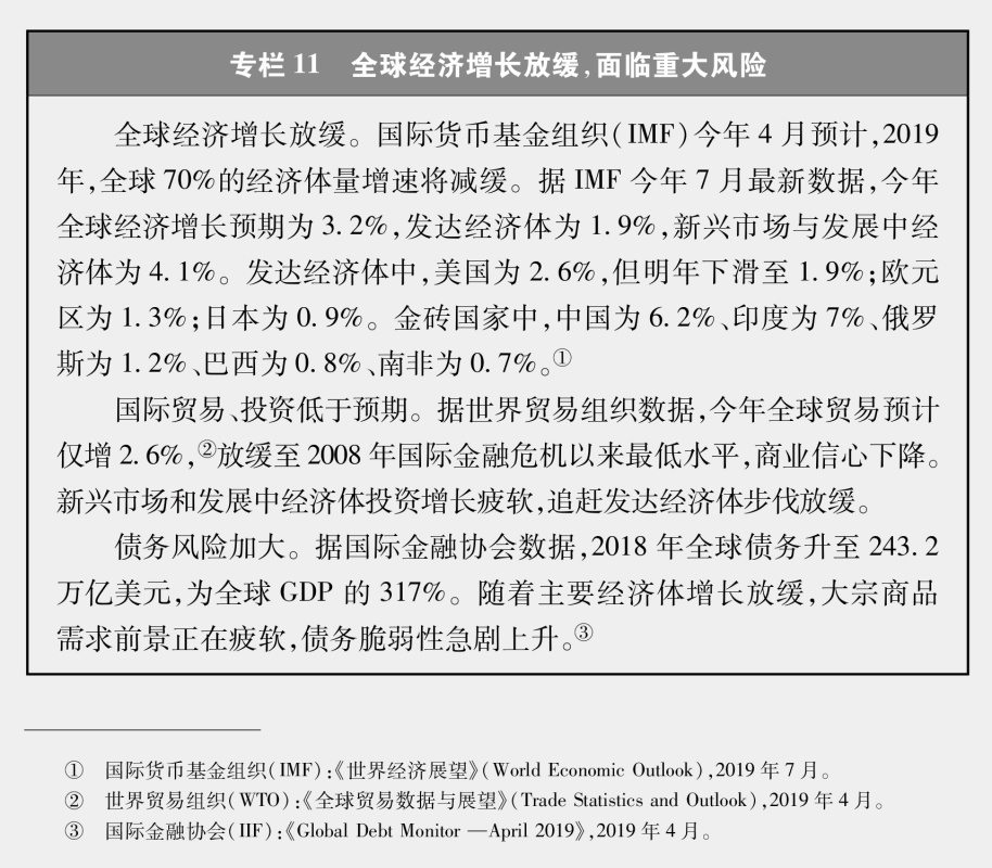 大變局充滿(mǎn)風(fēng)險(xiǎn)和挑戰(zhàn)。大變局深刻復(fù)雜、變亂交織,各種新舊因素、力量、矛盾相互疊加碰撞,大國(guó)關(guān)系、國(guó)際秩序、地區(qū)安全、社會(huì)思潮、全球治理深刻重塑,國(guó)際局勢(shì)不穩(wěn)定性不確定性日益突出,治理赤字、信任赤字、和平赤字、發(fā)展赤字越來(lái)越大,世界面臨重新陷入分裂甚至對(duì)抗的風(fēng)險(xiǎn)。全球經(jīng)濟(jì)增長(zhǎng)動(dòng)能不足、增速放緩,資本過(guò)度逐利導(dǎo)致貧富分化持續(xù)加大,貿(mào)易保護(hù)主義愈演愈烈,全球公共和私人債務(wù)高企,部分新興經(jīng)濟(jì)體出現(xiàn)較大金融動(dòng)蕩,全球經(jīng)濟(jì)下行壓力增大(專(zhuān)欄11)。國(guó)際安全形勢(shì)嚴(yán)峻復(fù)雜,國(guó)際戰(zhàn)略競(jìng)爭(zhēng)日趨激烈,地區(qū)安全局勢(shì)持續(xù)緊張,大規(guī)模殺傷性武器擴(kuò)散、恐怖主義、網(wǎng)絡(luò)攻擊、氣候變化、生物安全、有組織犯罪、重大傳染性疾病等傳統(tǒng)和非傳統(tǒng)安全問(wèn)題相互聯(lián)動(dòng),嚴(yán)重威脅全球和地區(qū)安全。圍堵遏制、對(duì)抗威脅的冷戰(zhàn)思維沉渣泛起,霸權(quán)主義、強(qiáng)權(quán)政治甚囂塵上,叢林法則、零和博弈找到新的土壤,嚴(yán)重侵蝕動(dòng)搖戰(zhàn)后國(guó)際秩序基礎(chǔ)。一些西方國(guó)家治理陷入困境,民粹主義泛濫,逆全球化加劇。國(guó)際軍控和裁軍遭遇挫折,軍備競(jìng)賽趨勢(shì)顯現(xiàn),戰(zhàn)略平衡與穩(wěn)定受到破壞,一些地區(qū)熱點(diǎn)問(wèn)題矛盾持續(xù)激化、對(duì)抗不斷升級(jí),戰(zhàn)爭(zhēng)幽靈若隱若現(xiàn)。信息化智能化迅猛發(fā)展,對(duì)人類(lèi)生命的存在形式、活動(dòng)方式、倫理道德等提出了不可忽視的挑戰(zhàn)。