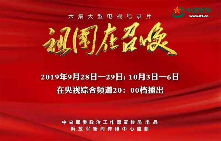 為熱烈慶祝中華人民共和國成立70周年,經(jīng)中央軍委批準(zhǔn),中央軍委政治工作部組織拍攝了6集大型電視紀(jì)錄片《祖國在召喚》。該片從9月28日起在中央電視臺綜合頻道八點檔播出,每天1集,國防軍事頻道等其他頻道重播,中央主要新聞網(wǎng)站、重點門戶網(wǎng)站和“學(xué)習(xí)強國”平臺等同步推出。