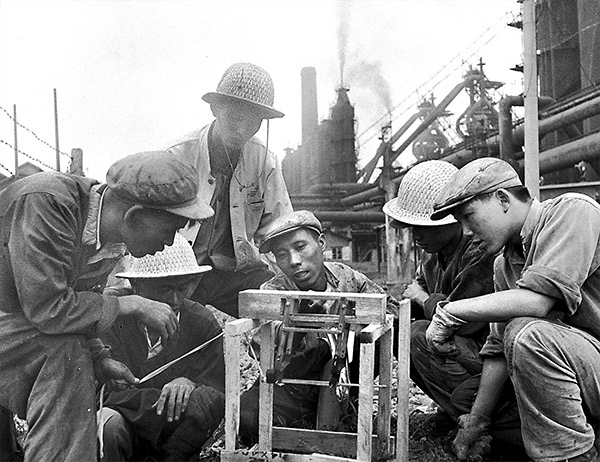 馬鞍山鋼鐵公司,是我國(guó)江南一個(gè)重要的鋼鐵基地。1964年,我國(guó)第一個(gè)直徑為840毫米的整體車輪在馬鋼誕生。這是公司二鐵廠技術(shù)革新小組在研究革新高爐堵渣機(jī)的問題。新華社記者 朱云風(fēng) 攝
