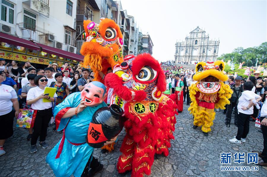 9月27日,舞獅隊伍在澳門大三巴牌坊前表演。 當(dāng)日,澳門旅游局舉行傳統(tǒng)托盤比賽慶祝世界旅游日,參賽者需單手托起有啤酒的托盤,從大三巴走到議事亭前地。 新華社記者 張金加 攝