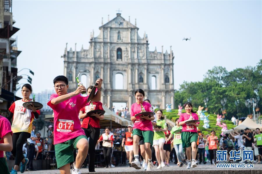 9月27日,在澳門大三巴牌坊前,女子組參賽者在進(jìn)行比賽。 當(dāng)日,澳門旅游局舉行傳統(tǒng)托盤比賽慶祝世界旅游日,參賽者需單手托起有啤酒的托盤,從大三巴走到議事亭前地。 新華社記者 張金加 攝
