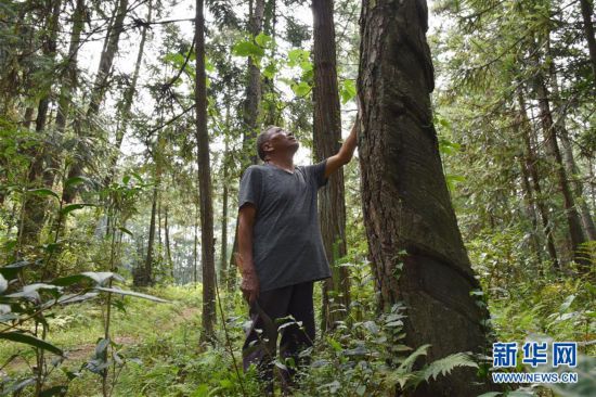 高石坎護(hù)林隊(duì)護(hù)林員田儒強(qiáng)在林場(chǎng)查看樹木(9月3日攝)。新華社記者 汪軍 攝
